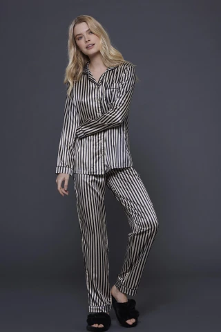 Pigiama donna riga pantalone rigato senza polsino e top abbottonato manica lunga con rever e scollo a V
