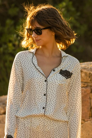 Pigiama donna viscosa dots top manica lunga con dettagli in pizzo sulla manica e sul taschino, colletto con rever e abbottonatura centrale, pantalone lungo con dettagli in pizzo sul fondo