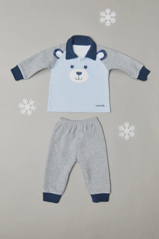 Pigiama neonato micropile top celeste con applicazione e pantalone grigio con polsino