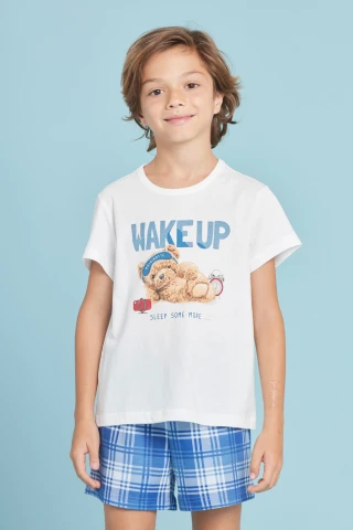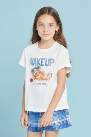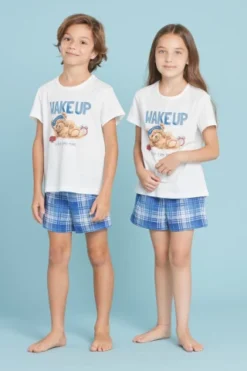 Pigiama unisex cotone baby bear top panna manica corta con stampa orsetto e pantalone corto con stampa scozzese blu