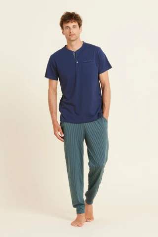 Pigiama uomo 3 pezzi cotone liam top manica corta con scollo serafino e taschino pantalone lungo a righe con polsino e tasche laterali e pantalone corto a righe