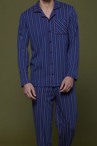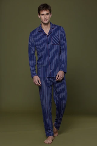Pigiama uomo caldo cotone martin pantalone blu con stampa a righe senza polsino e top abbottonato con stampa a righe blu