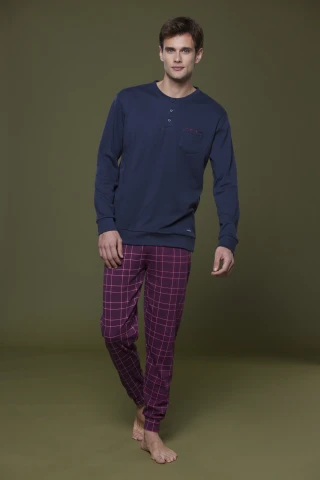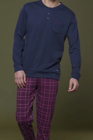 Pigiama uomo caldo cotone terence con pantalone scozzese bordeaux e top blu con taschino