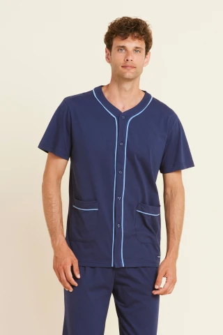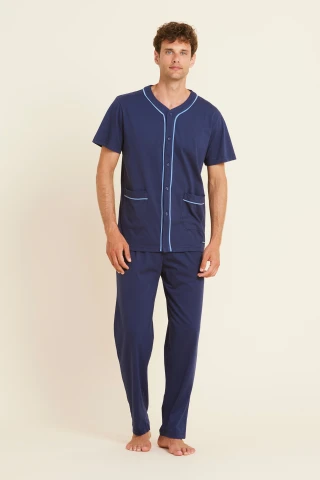 Pigiama uomo cotone ralph top aperto davanti con abbottonatura e scollo a V a manica corta con profili azzurri e pantalone lungo con polsino tinta unita blu