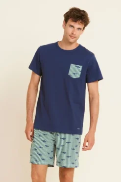 Pigiama uomo cotone shark top manica corta con taschino e pantalone corto con stampa sharky allover