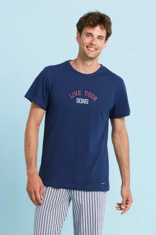 Pigiama uomo cotone song top blu manica corta girocollo, pantalone lungo grigio con stampa a righe e polsino