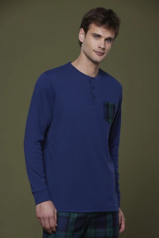 Pigiama uomo top caldo cotone blu con taschino e pantaloni scozzesi in flanella con polsino