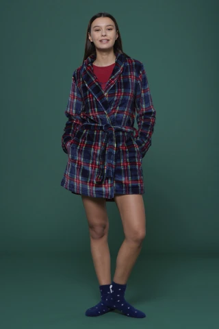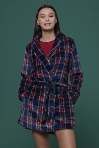 Vestaglia donna coral scottish mix con stampa scozzese cintura da annodare dello stesso tessuto e tasche laterali