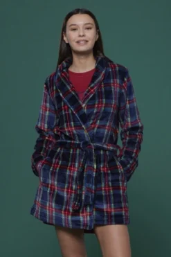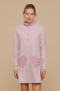 Vestaglia donna micropile viole con cintura da annodare dello stesso tessuto risvolti in coral e tasche laterali